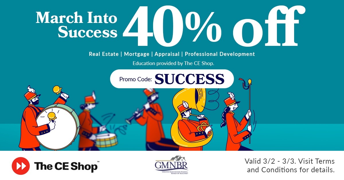 March is the perfect time to move forward with purpose. Take 40% off Licensing and Continuing Education when you visit The CE Shop and use code SUCCESS at checkout. Save on Real Estate, Mortgage, Appraisal, and Professional Development courses. Valid 3/2–3/3 only.