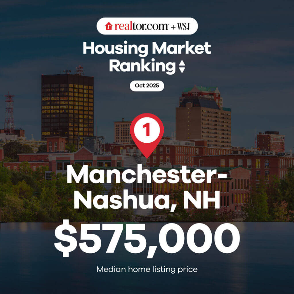 No. 1 Hot Market Manchester-Nashua is ranked no. 1 on the Wall St. Journal/Realtor.com Fall 2025 Housing Market Ranking. The ranking identifies markets that those considering a home purchase should add to their shortlist–whether the goal is to live in it or rent it as a home to others. #ManchesterNH #NashuaNH #GMNBR #RealtorPro https://www.realtor.com/research/october-2025-wsj-rdc-housing-market-ranking/ Back…