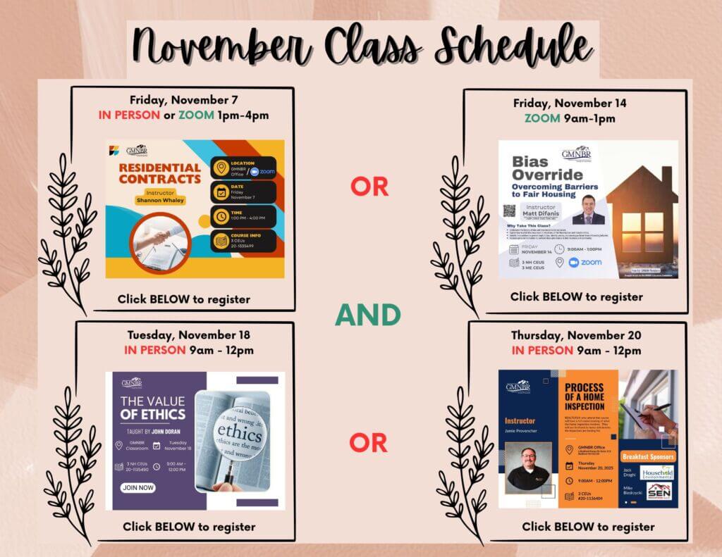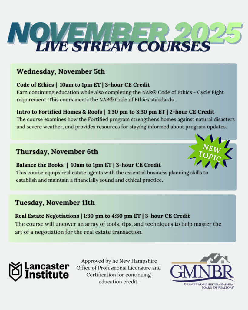 November Education Opportunities Need some more CE credits? Check out our class schedule for November. All of the links to register are below Residential Contracts in NH In Person: https://members.gmnbr.org/ap/Events/Register/OOFRDJOhaCqCD Zoom: https://members.gmnbr.org/ap/Events/Register/G9F51XXtNCxCK Bias Override: Overcoming Barriers to Fair Housing: https://members.gmnbr.org/ap/Events/Register/9eFbqe8FWC9Cx The Value of Ethics: https://members.gmnbr.org/ap/Events/Register/12F2anATgCVCB Process of a Home Inspection: https://members.gmnbr.org/ap/Events/Register/lzF7kEQTjC5Cw Back to All Posts